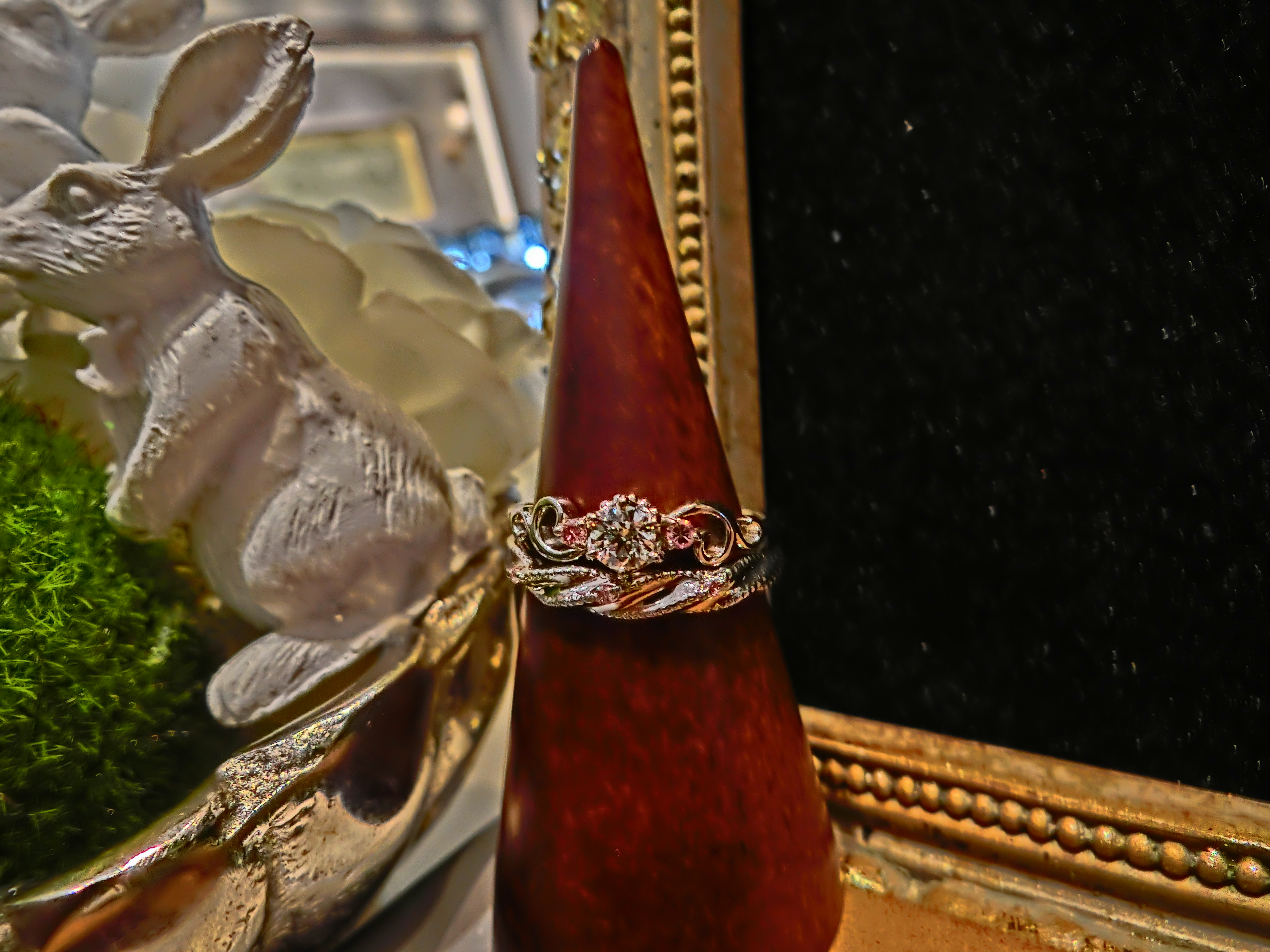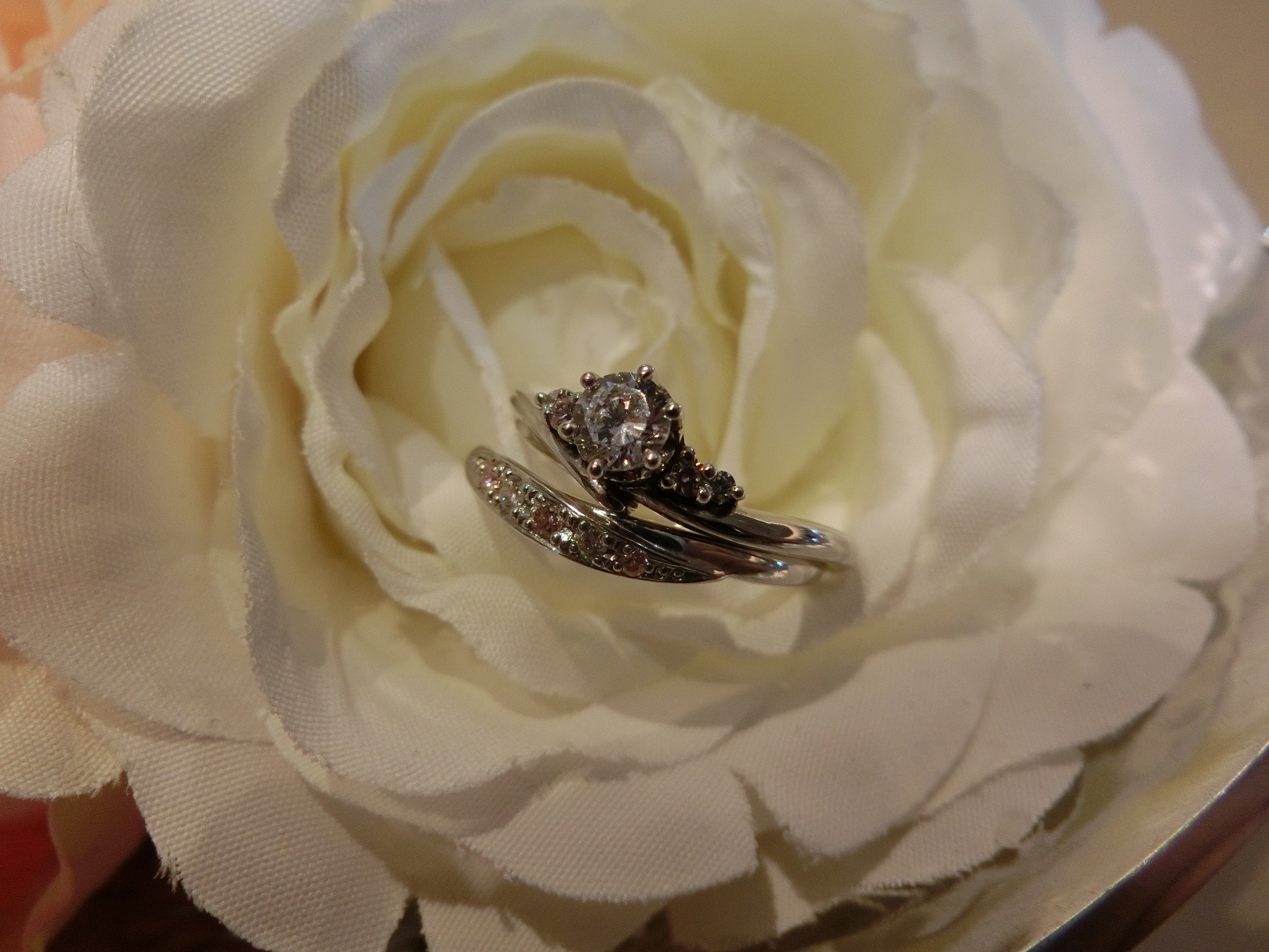 横の小さなメレダイヤにピンクダイヤを使っています(*ノωノ)