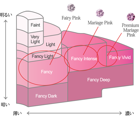 ピンクダイヤモンドの色は、【色の明るさ・暗さ】と、【色の濃い・薄い】2つの要素で評価されます。